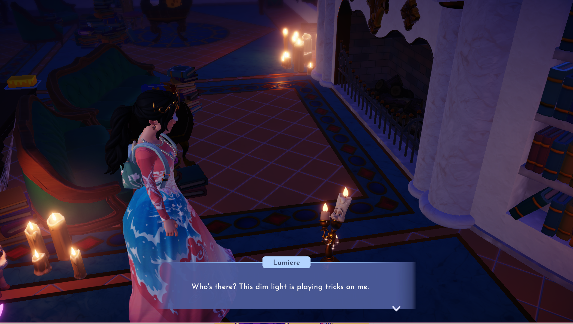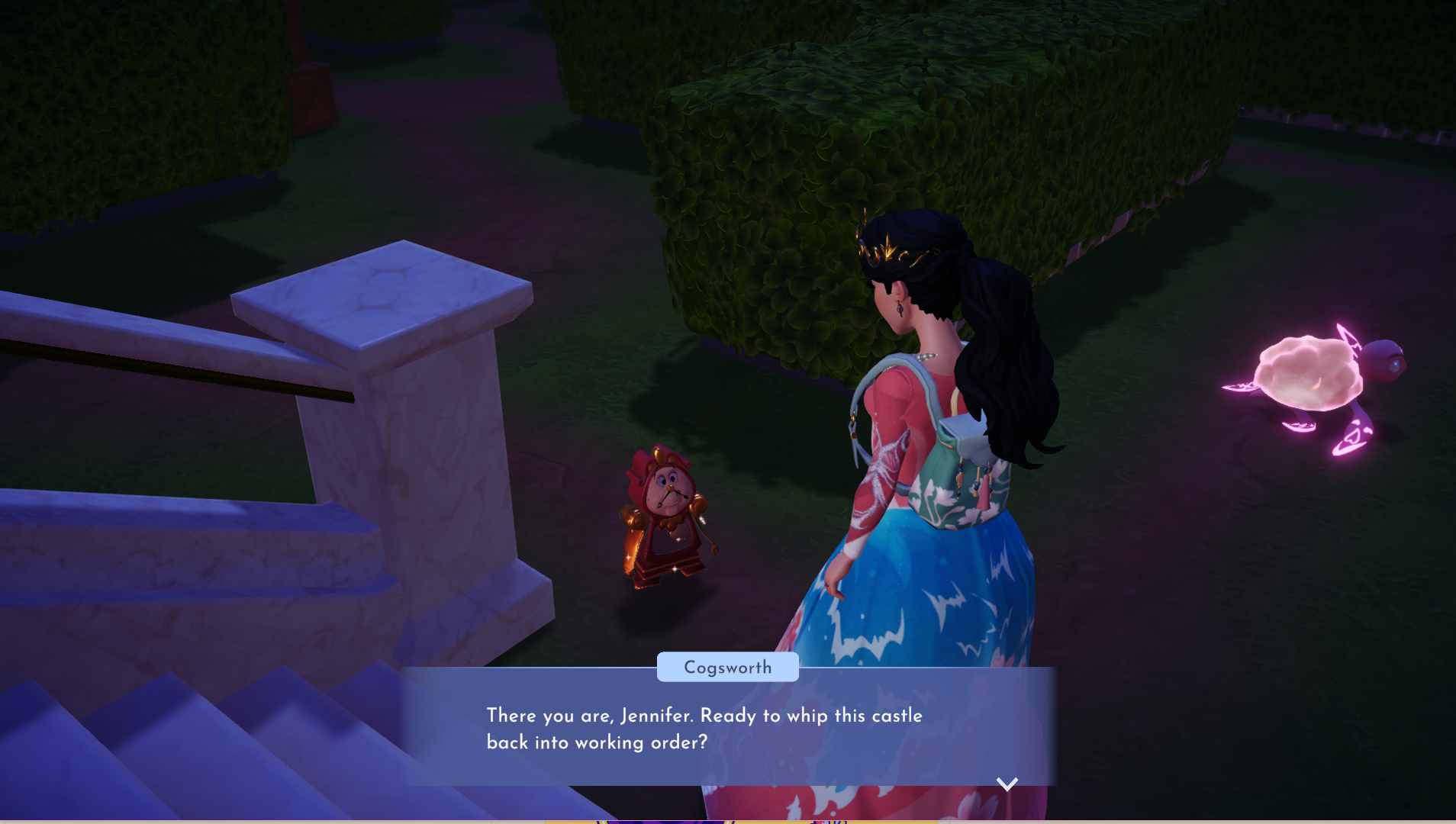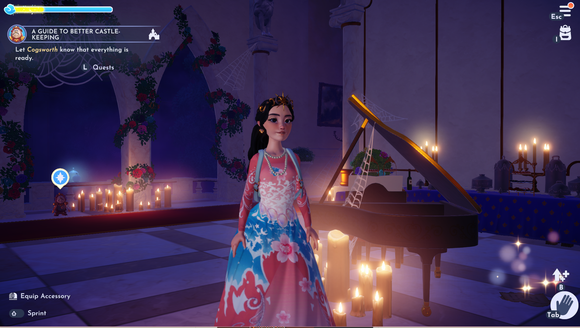 Getting back to the main point of the update, the castle is essentially covered in spiderwebs and dust with flickering lights. Regardless, we see Lumiere right away who thinks it’s a ghost. As we clean up, some mysterious things show up. We then end up heading to the Garden where Cogsworth is and unlike Lumiere, he feels there is a more scientific explanation for all this.