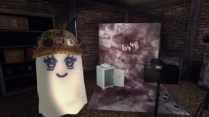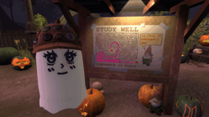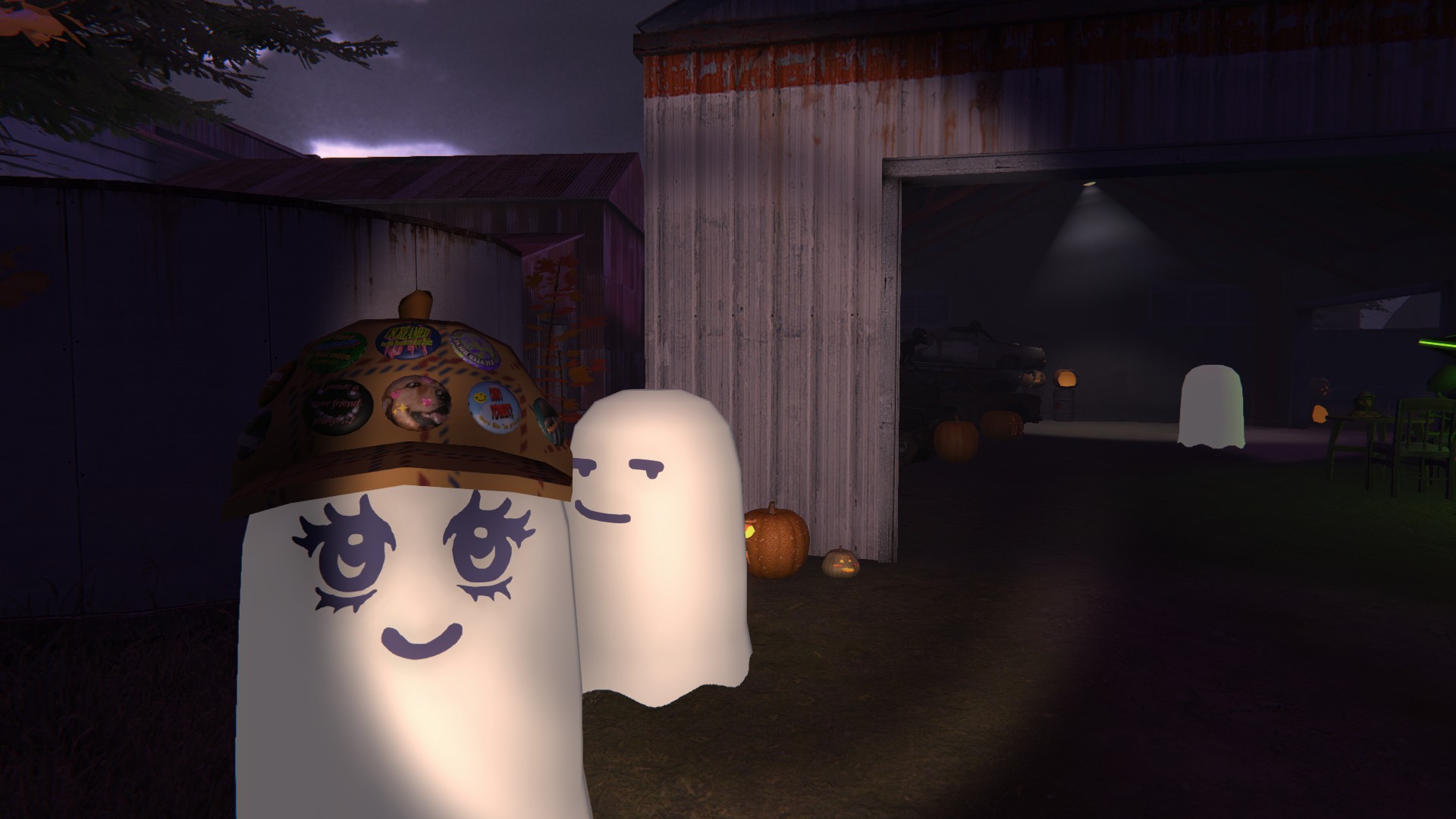 Obviously though, while we play as a ghost, this is a Pumpkin Carving game. You can pick any pumpkin on the cart of the main menu (or enter and exit for the cart to refresh new pumpkins) to carve it. You can make up to 5 Pumpkins each year and can place them around the Pumpkin Festival– there are only so many spots per “world” though so if one world is full, you may need to switch to a different one. You’ll know if you can place your Pumpkin in a spot if there is a glowing circle on a surface you try to place it on. (As a note, you can pick to place Pumpkins by opening the menu and clicking “Place Pumpkin”. The third option, Visit Alternate Universe allows you to switch servers. Hitting the Lightbulb puts the game in “daytime” mode– you can also hit shift to toggle between day and night. The 4th icon, the ribbon, lets you award one Pumpkin a day with a special ribbon).